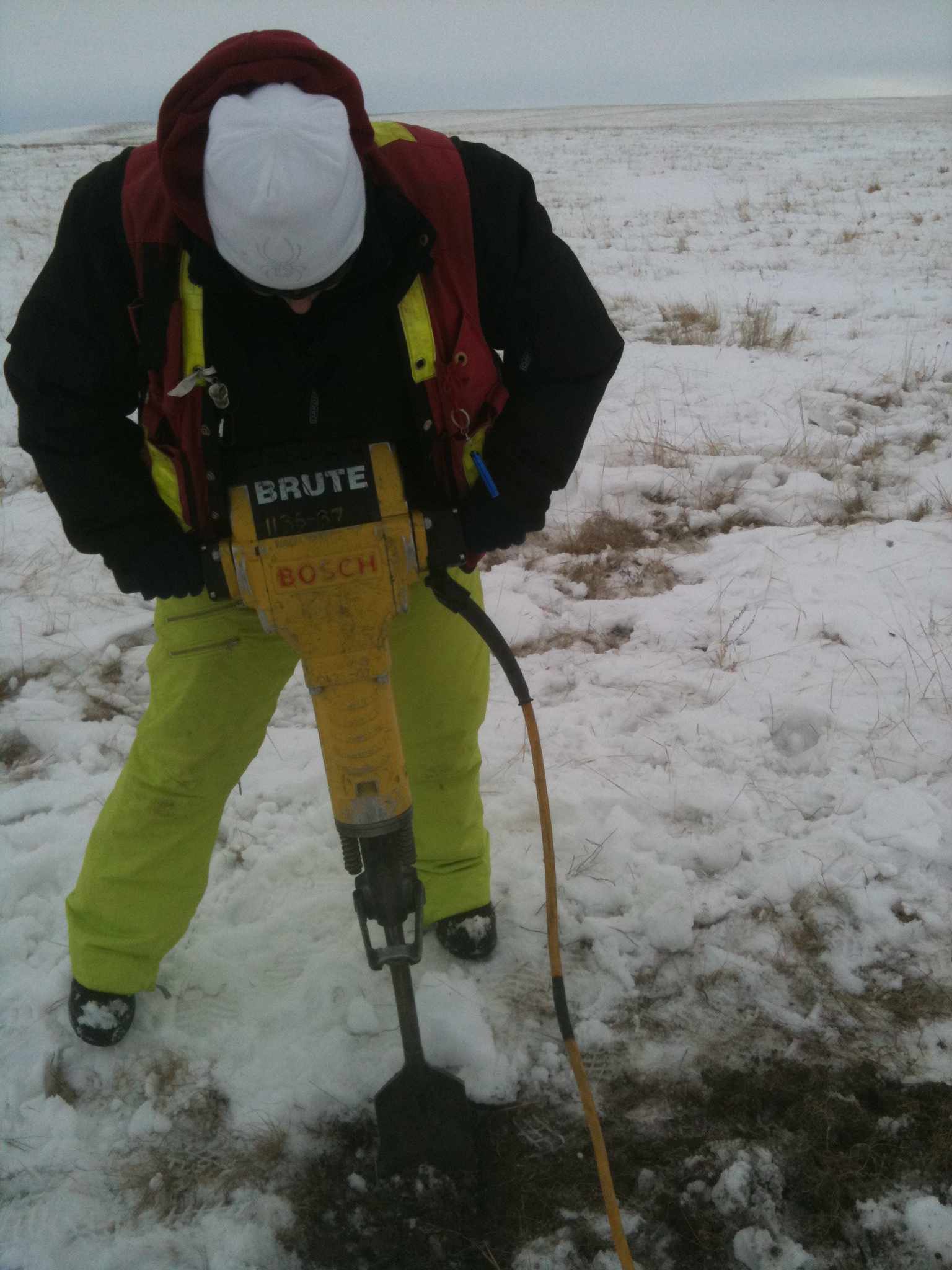 - Electric jackhammer. This was my go-to when I worked a lot on the plains. It involves lugging around a generator (plastic sled works great) and then digging holes with a jackhammer. In my younger days, this was a 60-lb machine, but then I downgraded to the 24 or 34-lb option. Critics would say you can create your own flakes this way, but I’d like to think we’re good enough to tell the difference between a prehistoric lithic and a freshly broken rock.