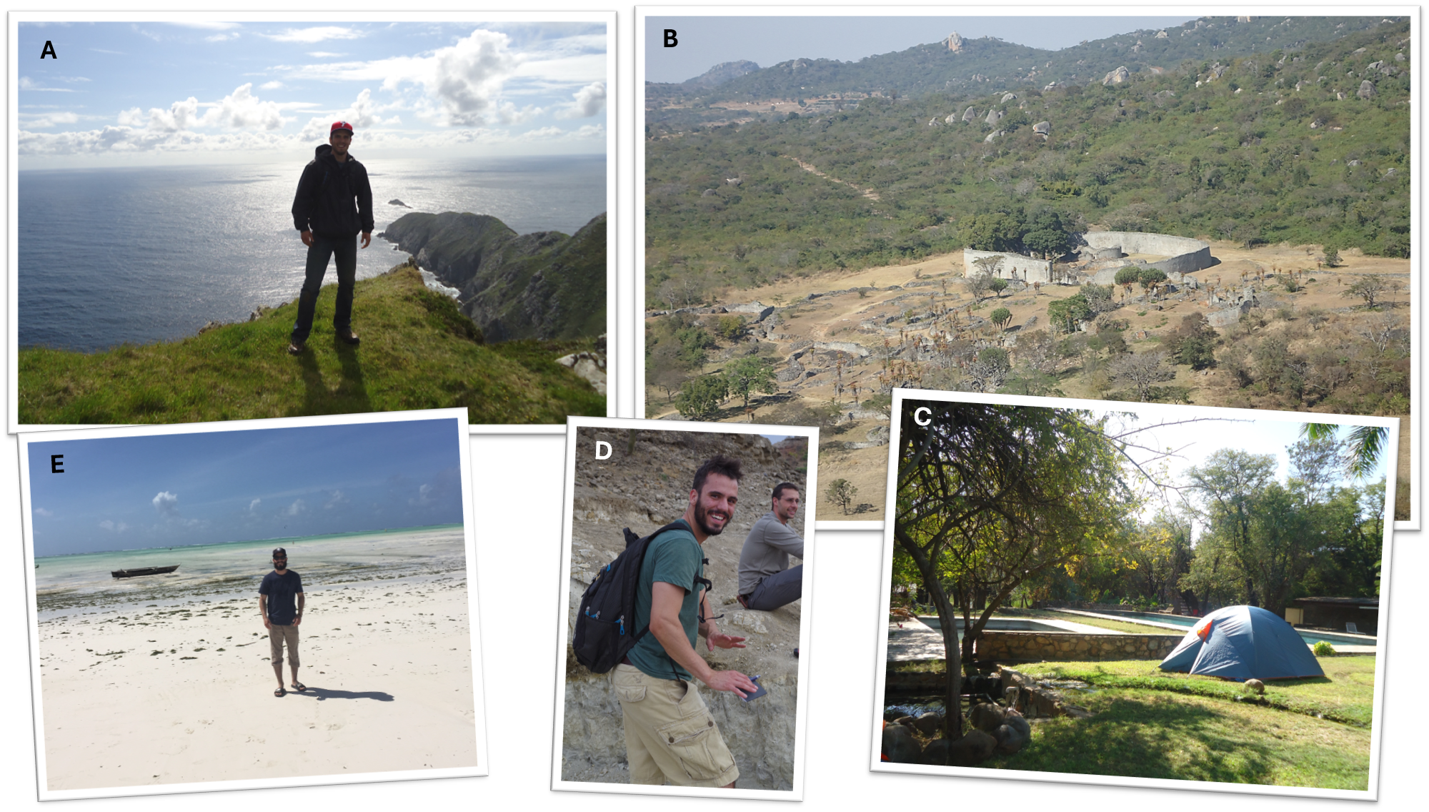 Internationally, I joined fieldschool excavations on Achill, one of the westernmost islands of Ireland (Photo 1A). Our team uncovered evidence that helped tell a story of settlement stretching back to the Middle Bronze Age. During my undergraduate years, I travelled to Zimbabwe with Prof. Julio Mercader. There, we excavated a fascinating Acheulean site with prepared core technology, camped beside a hot-spring-fed pool, and visited the majestic ruins of Great Zimbabwe (Photo 1B–C), not exactly your average field trip.